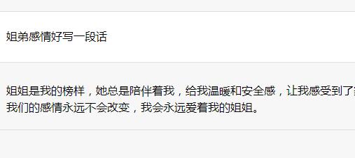 最后,希望每个家庭都充满爱和活力:)姐姐是我的榜样,她总是陪伴着我,给我温暖和安全感,让我感受到了家庭的温暖,她总是给我提出宝贵的建议,让我在生活中更加坚强,我们之间的感情深厚,我们一起度过了许多快乐的时光,我们的感情永远不会改变,我会永远爱着我的姐姐。